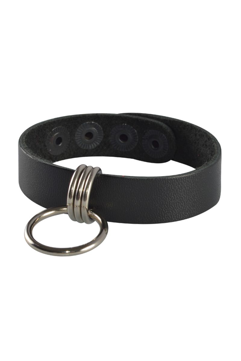 Браслет из натуральной кожи, украшен подвесным металлическим кольцом. Регулируется при помощи кнопок. Металлическое кольцо имеет никелевое покрытие. Ширина - 1,5 см.