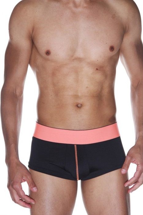 Мужские хипсы из эластичной черной ткани, со строчками и широким поясом персикового цвета.