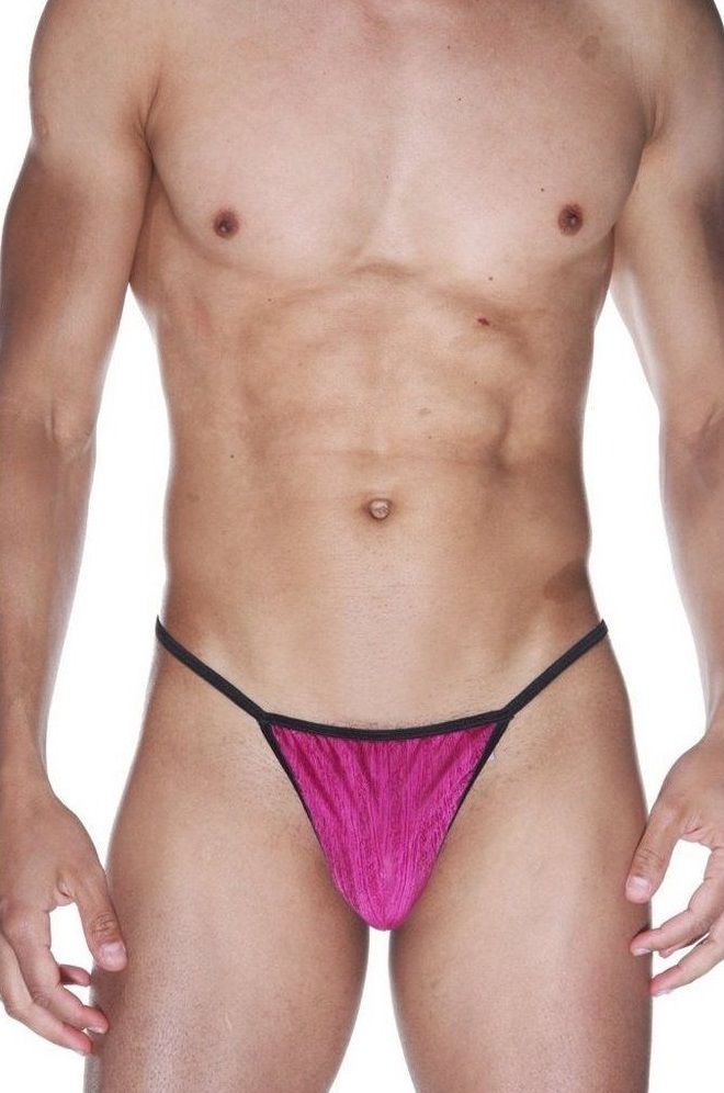 Мужские стринги цвета фуксия на тонких черных резинках.