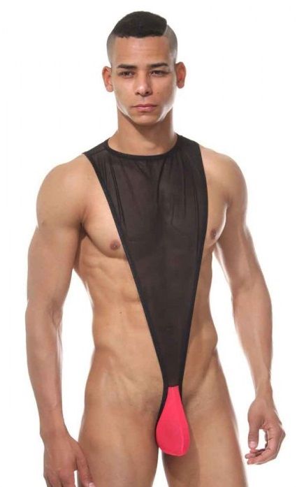 Оригинальное боди для мужчин, в котором скомбинирована верхняя полупрозрачная с контрастным гульфиком.