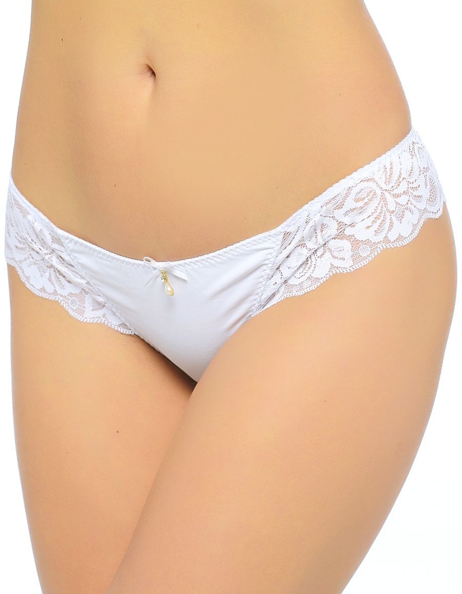 Трусики-стринг, комбинированные из мягкой эластичной ткани и кружева. Спереди украшены бантиком и жемчужной капелькой, сзади напоминают изящный кружевной пояс.
