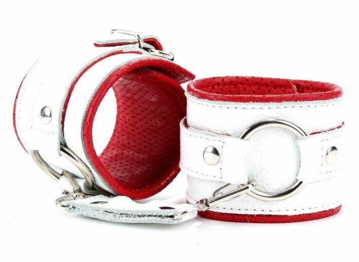Наручники из белой кожи с кольцом с мягким подкладом из перфорированной кожи. Сварная металлическая фурнитура для надежной фиксации. Ширина - 6 см.