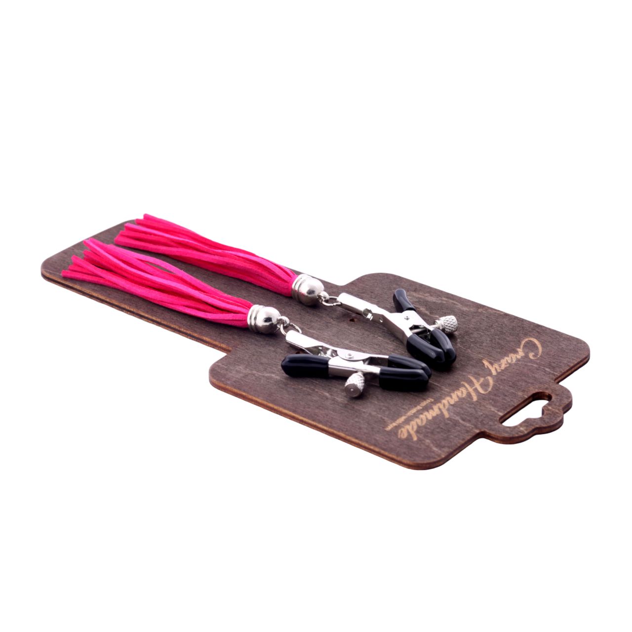 Зажимы мягко сдавливают соски за счет резиновых наконечников, а прикосновения кисточек из замши приятно ощущаются на коже. Сила сжатия зажимов регулируется болтиками. Длина кисточки - 8 см.